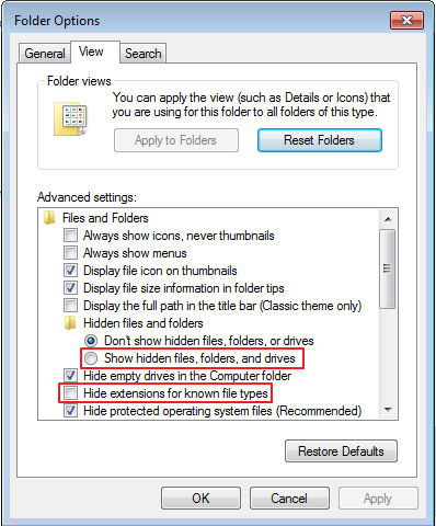 2. Uncheck 'Hide extensions for known file types' check box to show file name extentions.
